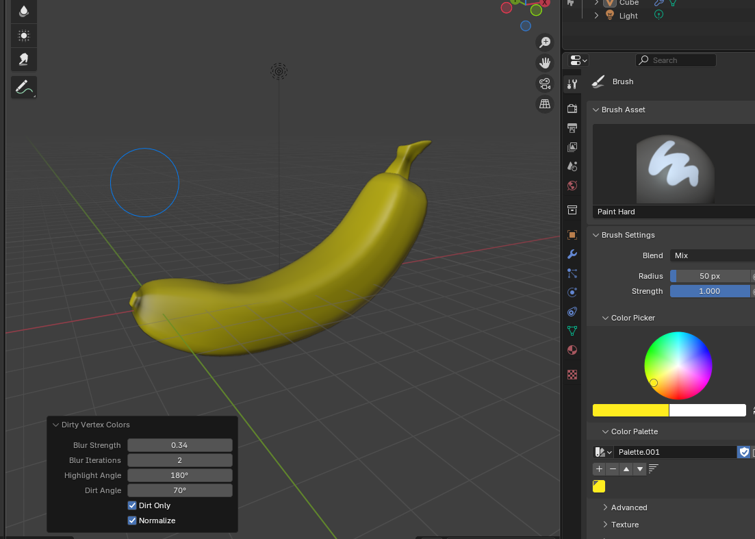 Extrude the a face of a cube to create the general shape of a banana.Scale the face down and extrude to create a stem, the move an edge to creat the angular part of the stem.Add a subdivision modifier to make the banana more smooth.Scale a face down and extrude the opposite end to create a tiny stub.Scale the end of the banana for a more realistic shape.Select some of the edges and move them around so the banana is more uneven.Sculpt the moved edges and give it a more realistic shape I scaled down the stem to make it thinnerWent into UV paint, went into vertex paint and then gave the banana a base cote of yellowAdded green and brown to the ends, I also added some green and brown throught the body to add some dirt.Here I remodeled the stem, I deleted the old stem, created a new face and did the same process.For the final shot i put it on a plate, which comes from a previous render I did in sec 5.Final Render