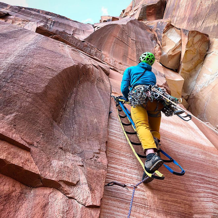 Aided climbing is a type of roped climbing where the climbers are assisted by ladders to help them gain upwards momentum when climbing. You use climbing protection by clipping your rope to clips that are in the wall. Like any other roped climbing, this type has a belayer to help with the slack and management of the rope. This type of climbing is predominantly done outside, but there are some specialized indoor gyms for this type of climbing.